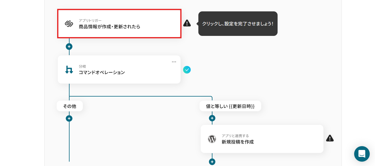 - Squarespaceのトリガー設定、分岐設定およびWordPressのアクション設定