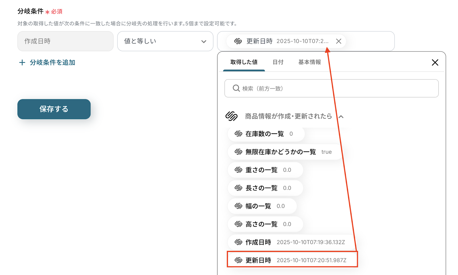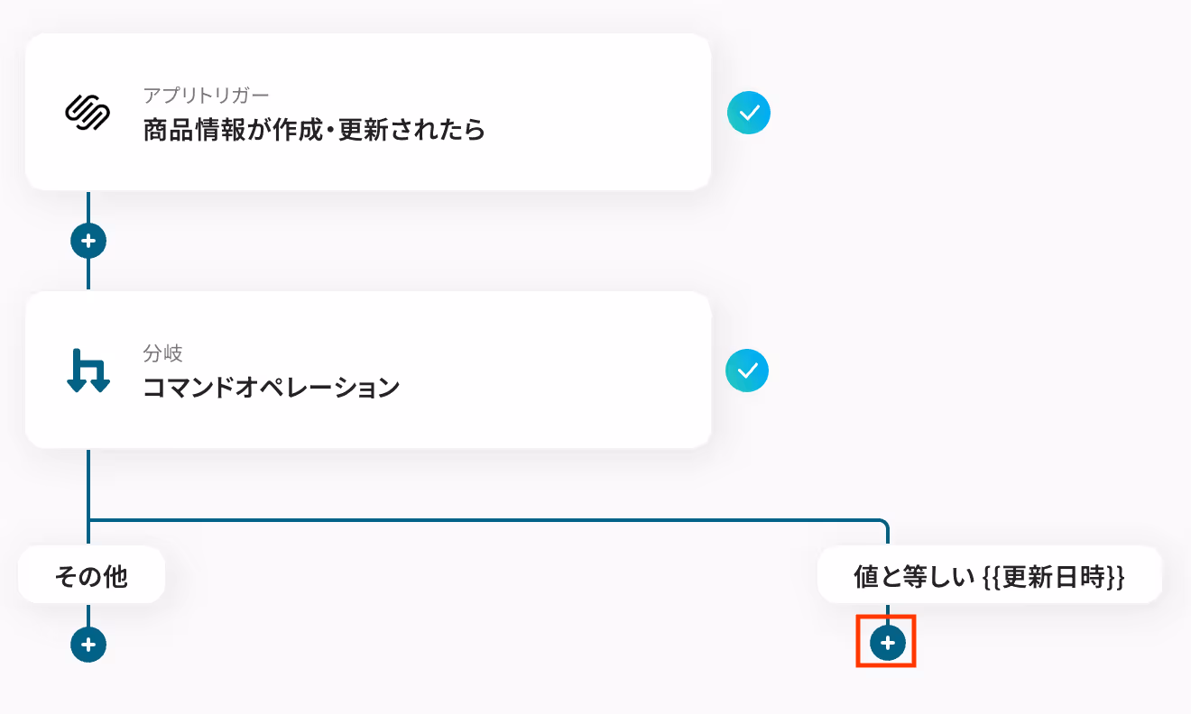 続いて、Squarespaceに作成された商品情報の作成日時に応じて、フローを分岐させる設定を行いましょう。