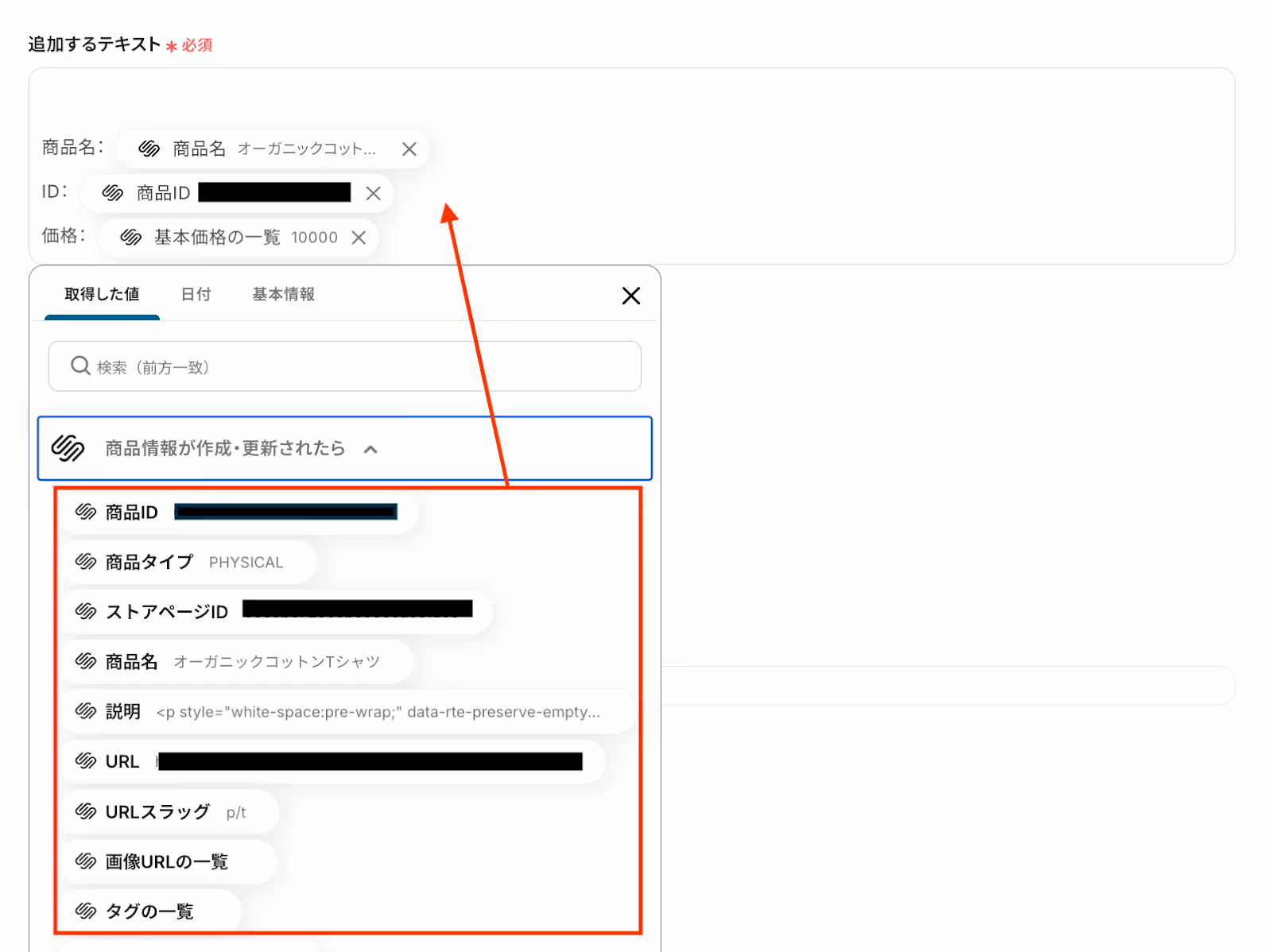 誤って削除してしまった場合などは、クリックして表示される取得した値から選択して入力しましょう。