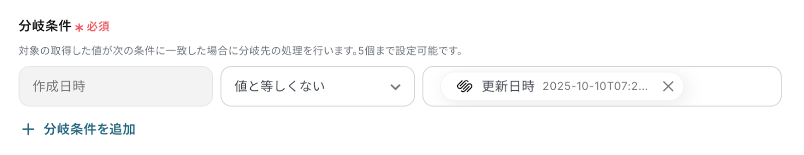 新規作成時のみではなく「更新のみ」を検知したい場合は、分岐オペレーションを使用し、作成日時と最終更新日時が等しくない場合に処理を実行するよう条件を設定してください。