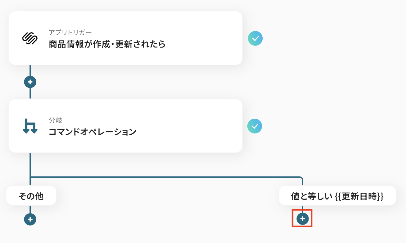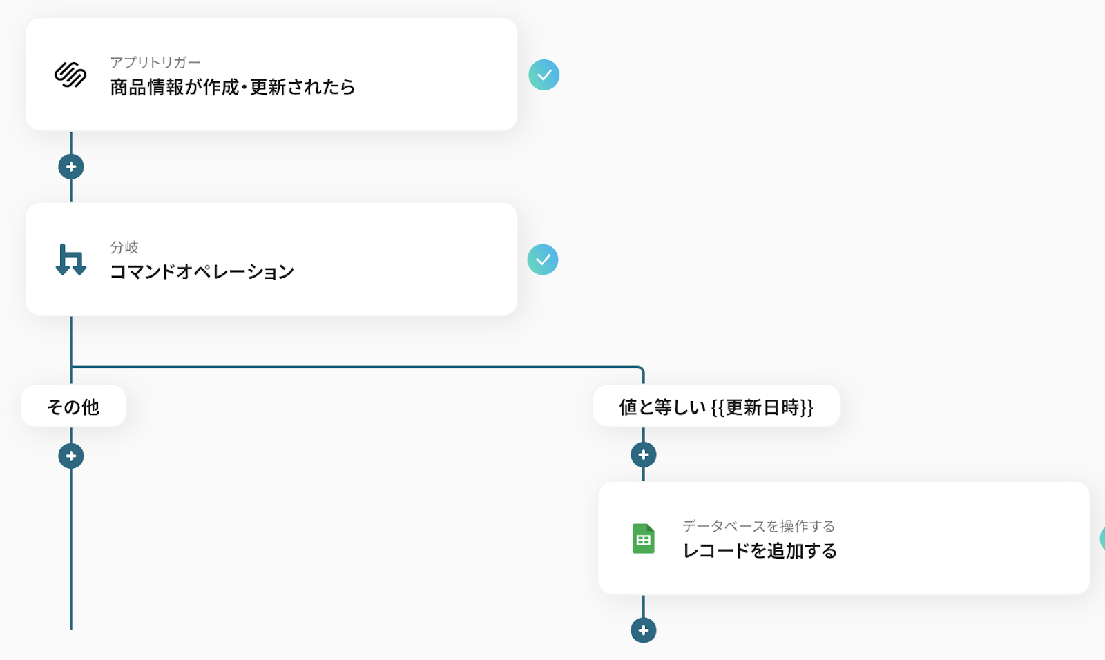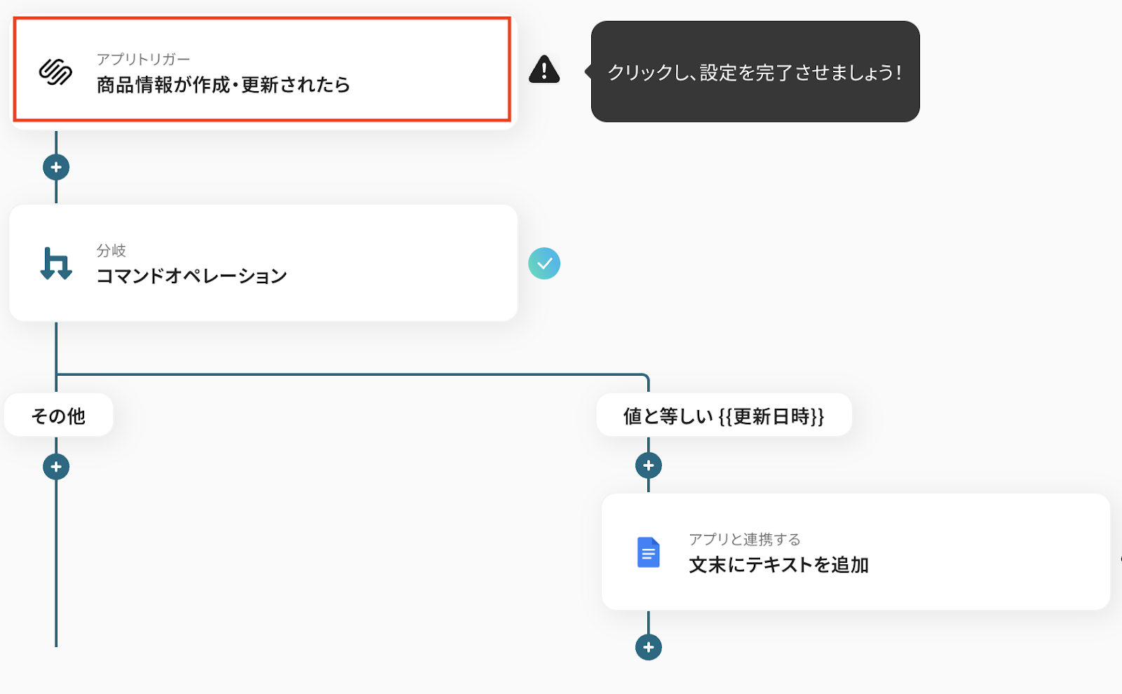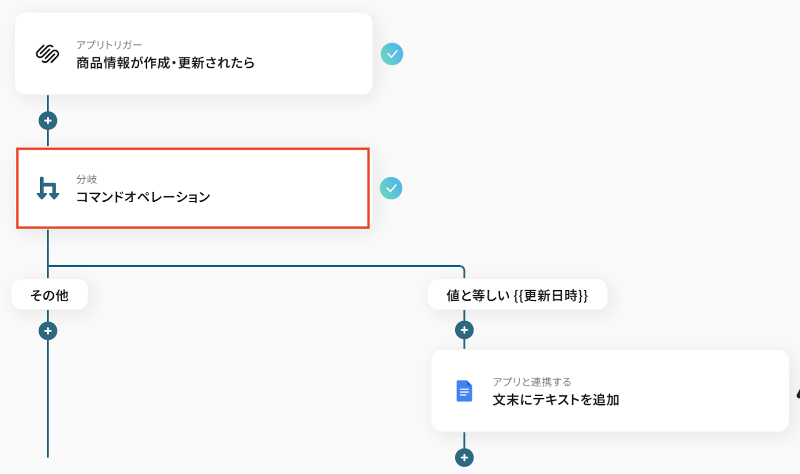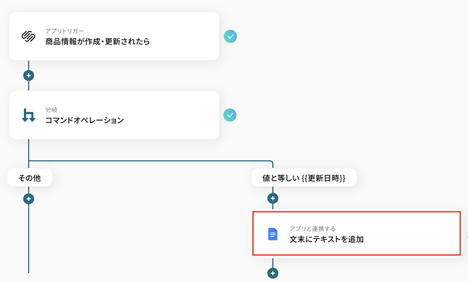 これにより、既存の商品が編集された場合のみ、Googleドキュメントに情報を追記または更新するフローを構築できます。