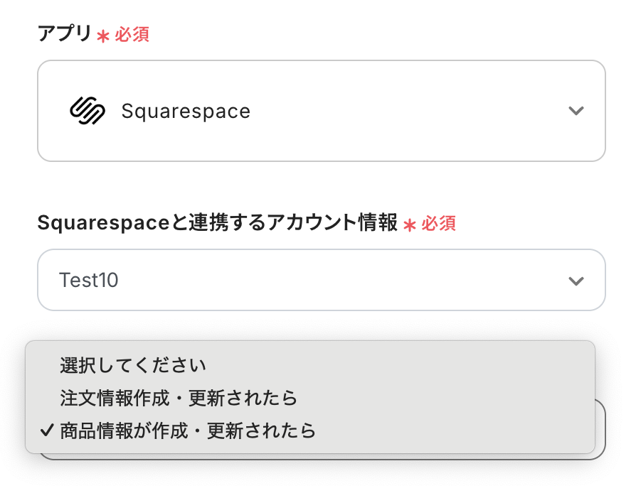 Squarespaceのトリガー設定では、「商品情報」に加えて「注文情報」も連携対象として利用できます。
