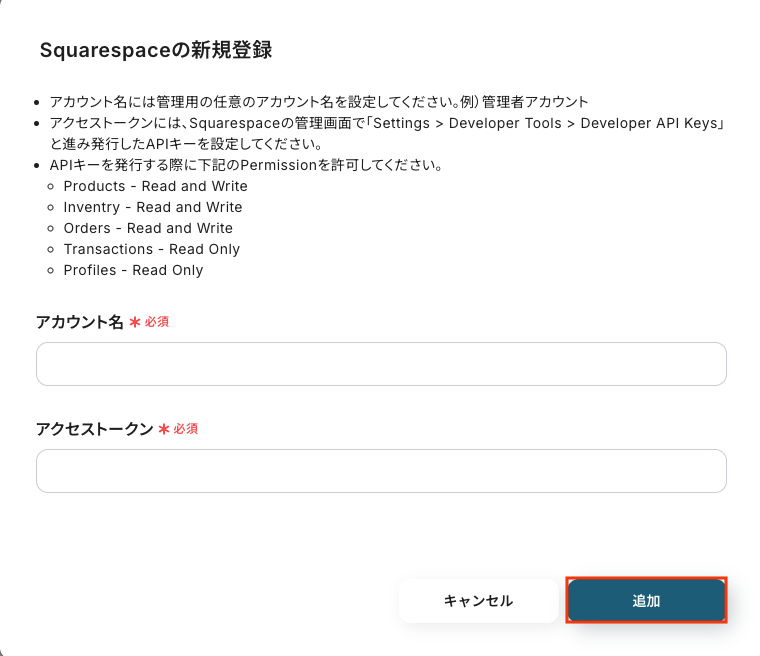 以下の画面が表示されるので、アカウント名とアクセストークンを注釈に沿ってそれぞれ入力し、「追加」をクリックしましょう。