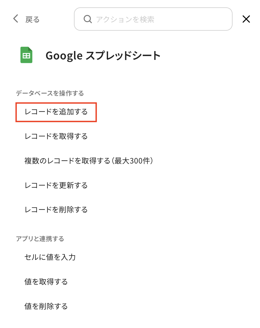 アクション項目から「レコードを追加する」を選択し、その後の設定を進めてください。