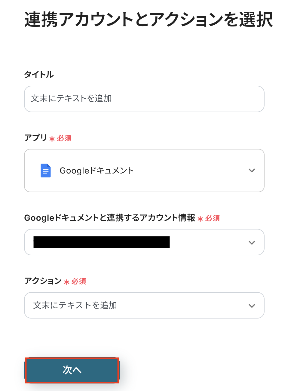 アプリとアクションはあらかじめ設定されているため、そのまま内容を確認してください。