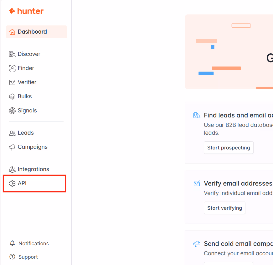 こちらのページからHunterアカウントにログインし、左側にあるメニューから「API」をクリックします。