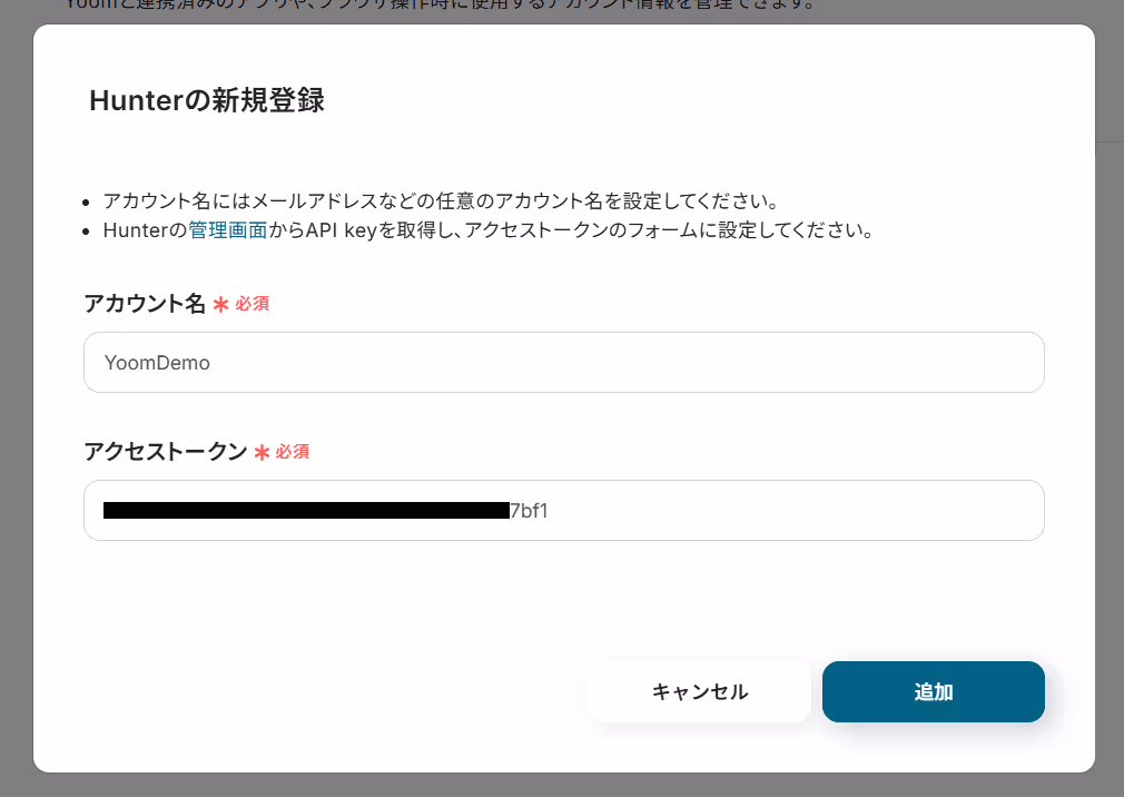 下図のような新規登録画面が表示されるので次のように設定し、「追加」を押したらYoomとの連携は完了です!