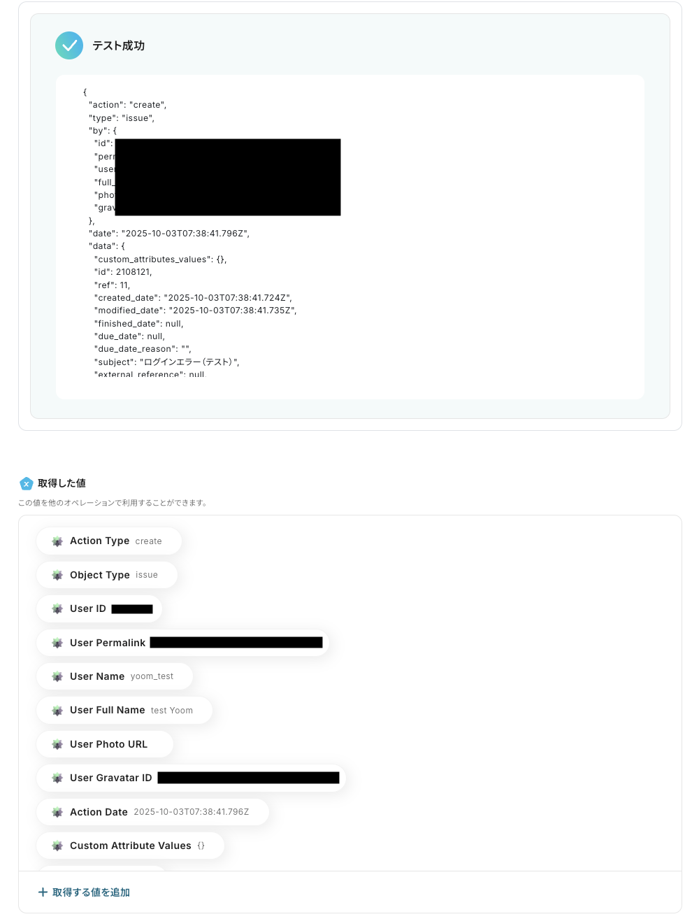 1.Taigaのアプリトリガー「Update Issue」でテストを実施し、「+取得する値を追加」をクリック。