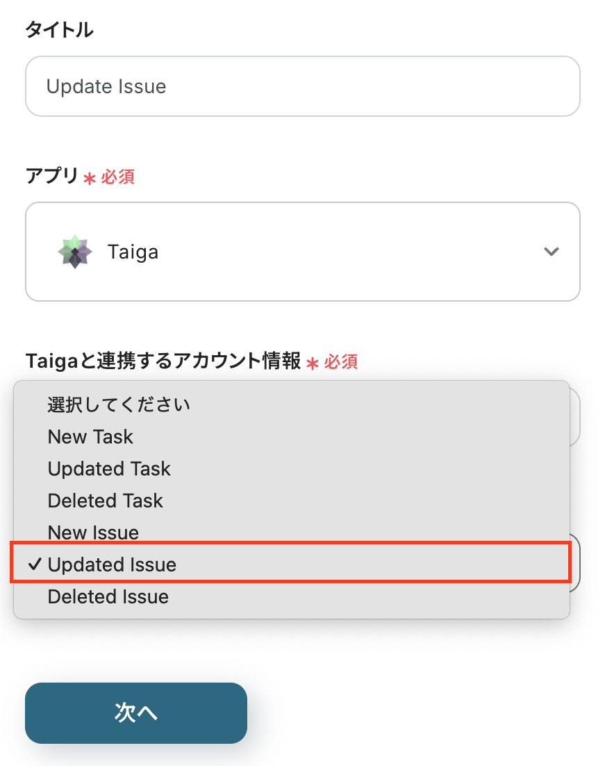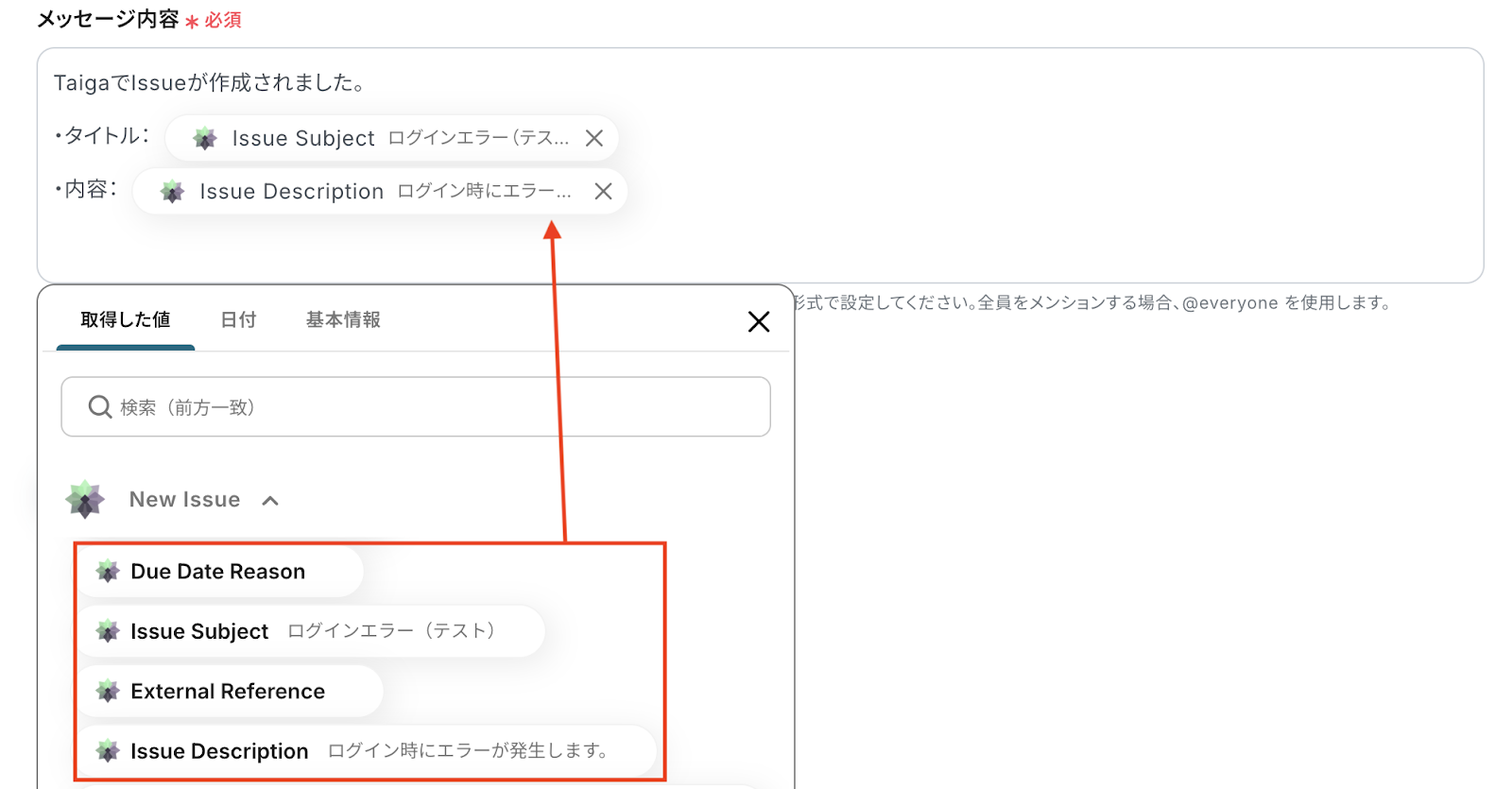 入力欄をクリックすると、前のステップでTaigaから取得した値が表示されるので、選択して入力可能です。