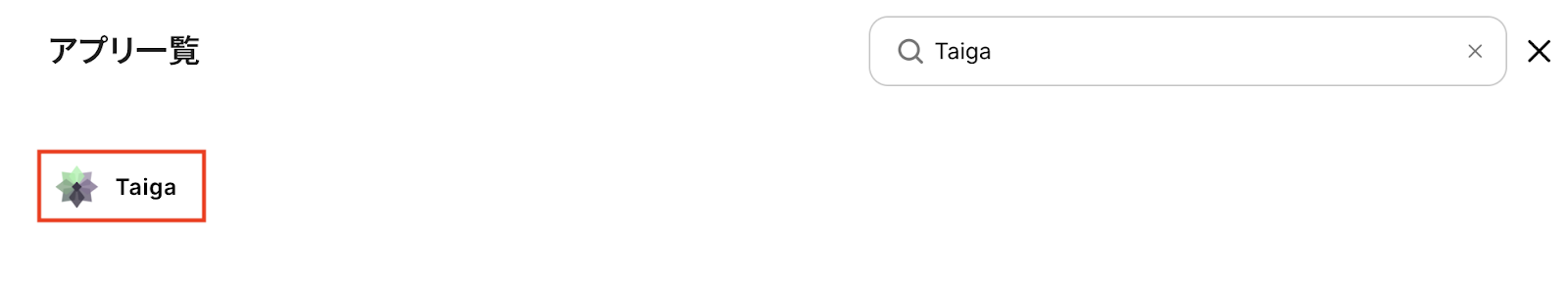 新規接続をクリックしたあと、アプリのメニュー一覧が表示されるのでTaigaと検索し、対象アプリをクリックしてください。