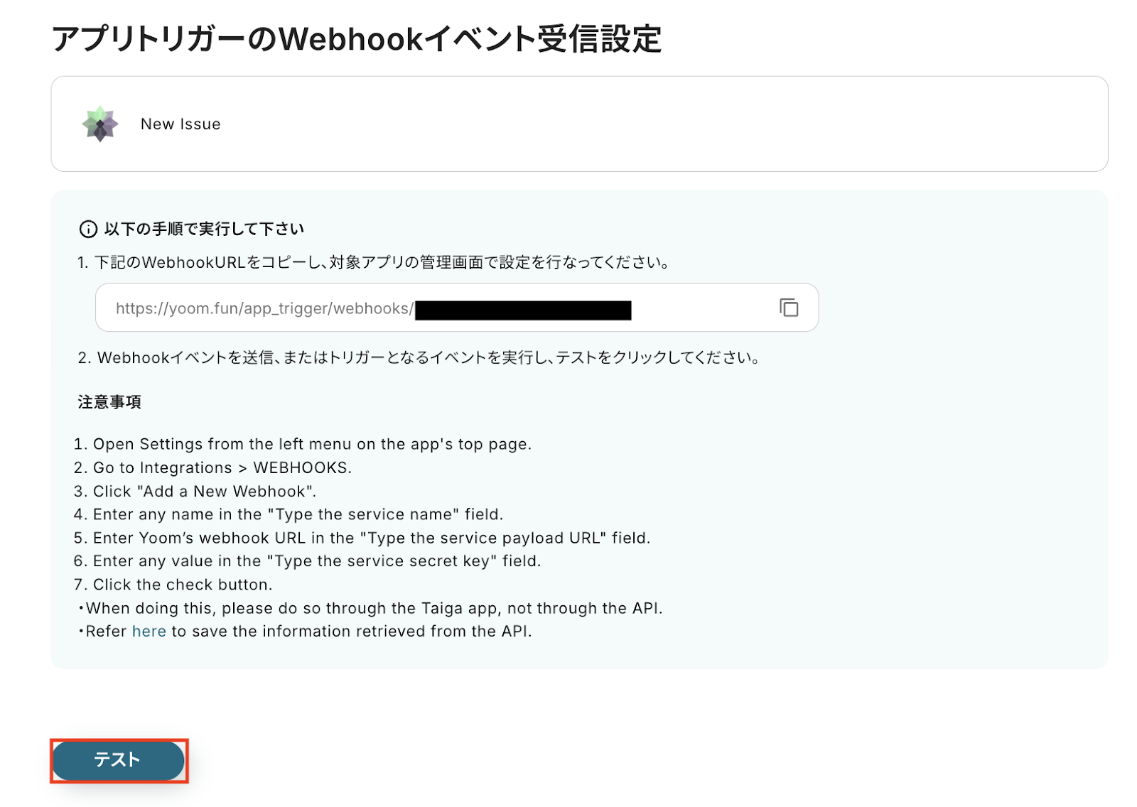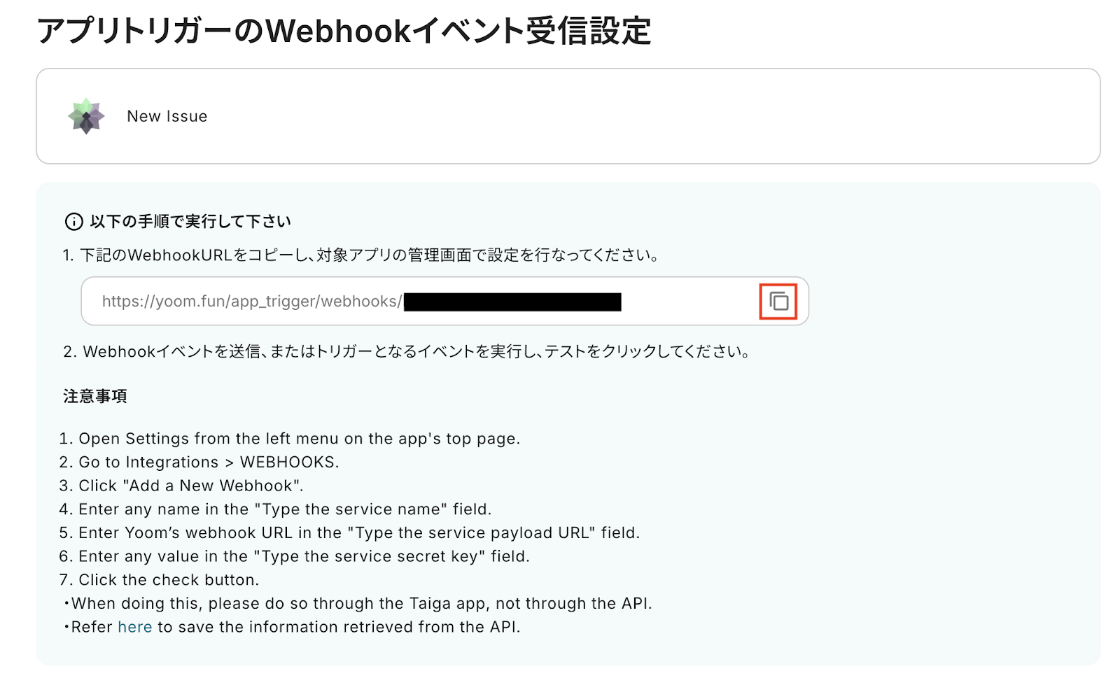 まずは、TaigaにWebhook URLを設定しておきましょう。