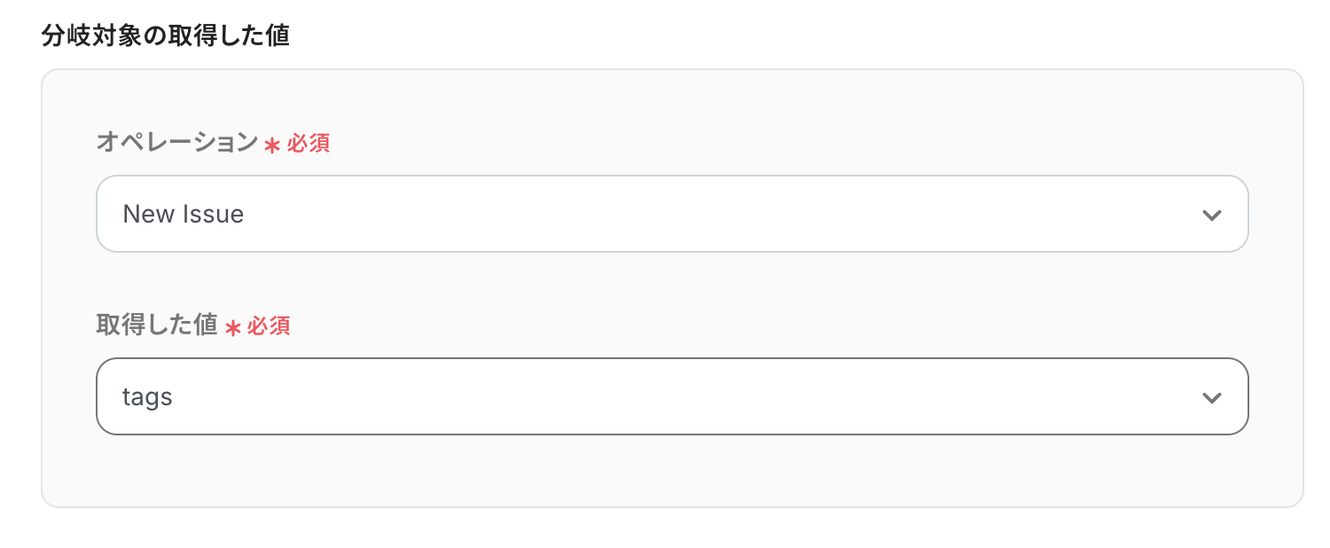 2.オペレーションは「New Issue」、取得した値は「tags」を選択。