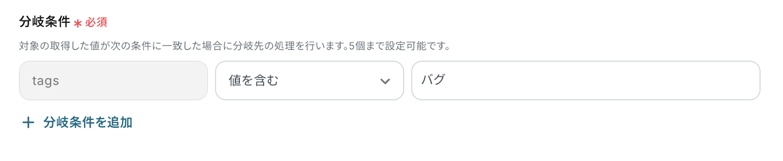 3.分岐条件を以下のように、「tagsにバグという値を含む場合」に設定します。
