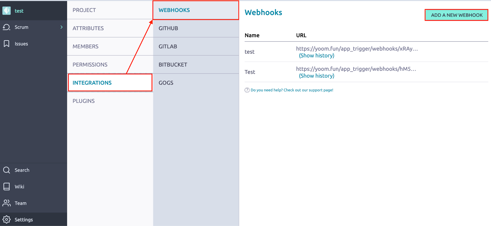 Integrations > WEBHOOKSへ進み、「Add a New Webhook」 を選択。