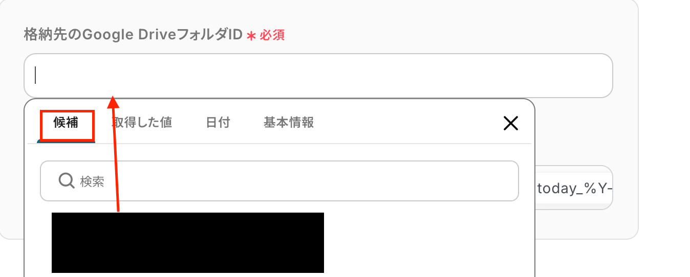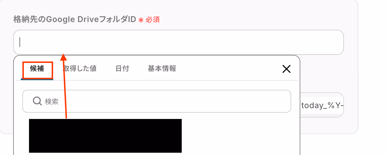 格納先のGoogle DriveフォルダIDは候補に表示される中から選択してください。