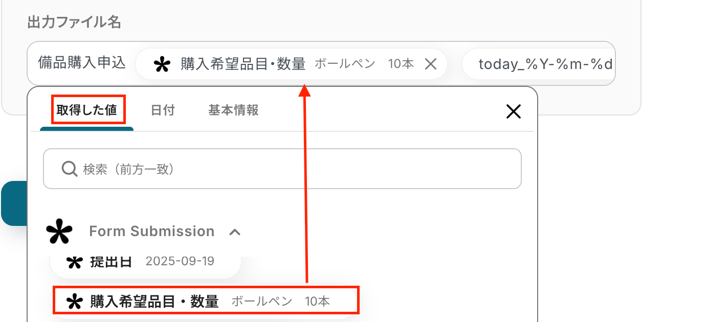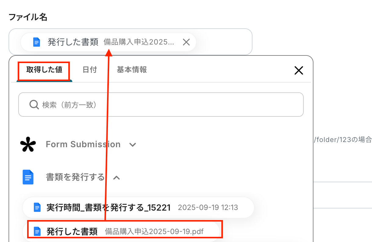 ファイル名はGoogleドキュメントの取得した値から選択しましょう。