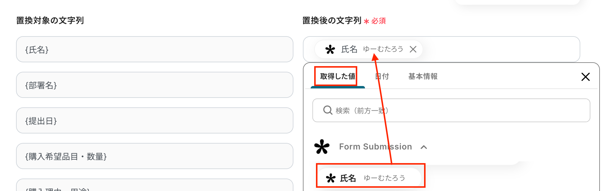 置換対象の文字列に合致する項目を置換後の文字列に設定します。