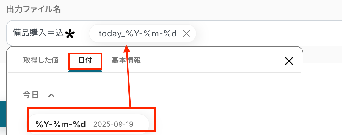 添付画像は例ですが、「日付」から「今日」を選択しておけば、ファイルの整理がしやすいですね。