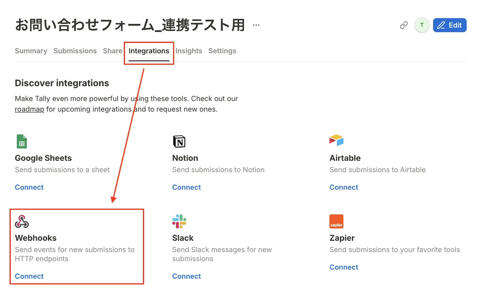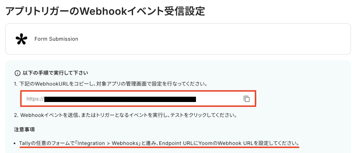 Webhookの設定はTallyの画面で行いますので、下図赤枠のURLをコピーしておき、フローで使用するTallyアカウントの画面に移動しましょう!