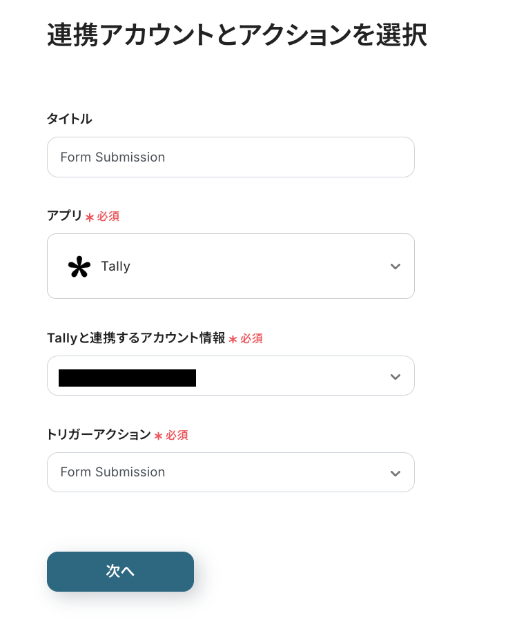 ステップ3と同様に「連携アカウントとアクションの選択」の設定内容を確認し、アクションは変更せずに「次へ」を押します。