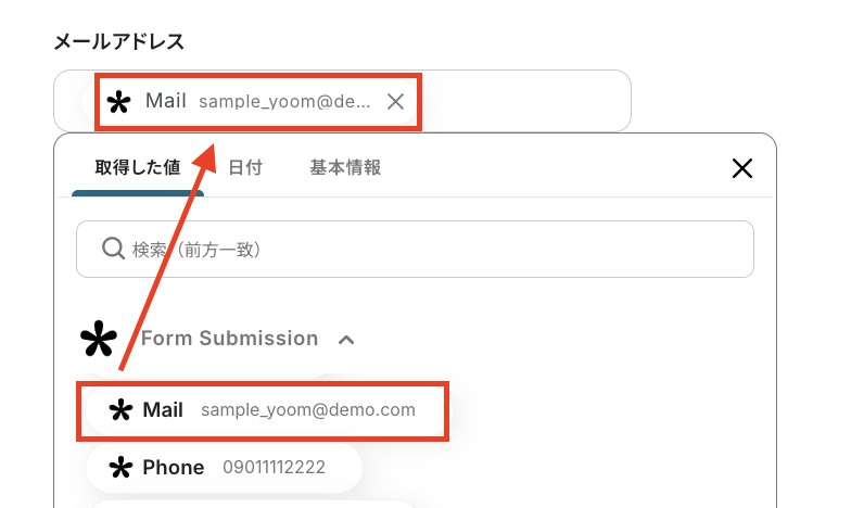 たとえば「メールアドレス」には、「取得した値」の「Form Submission」内にある「Mail」を選択します。