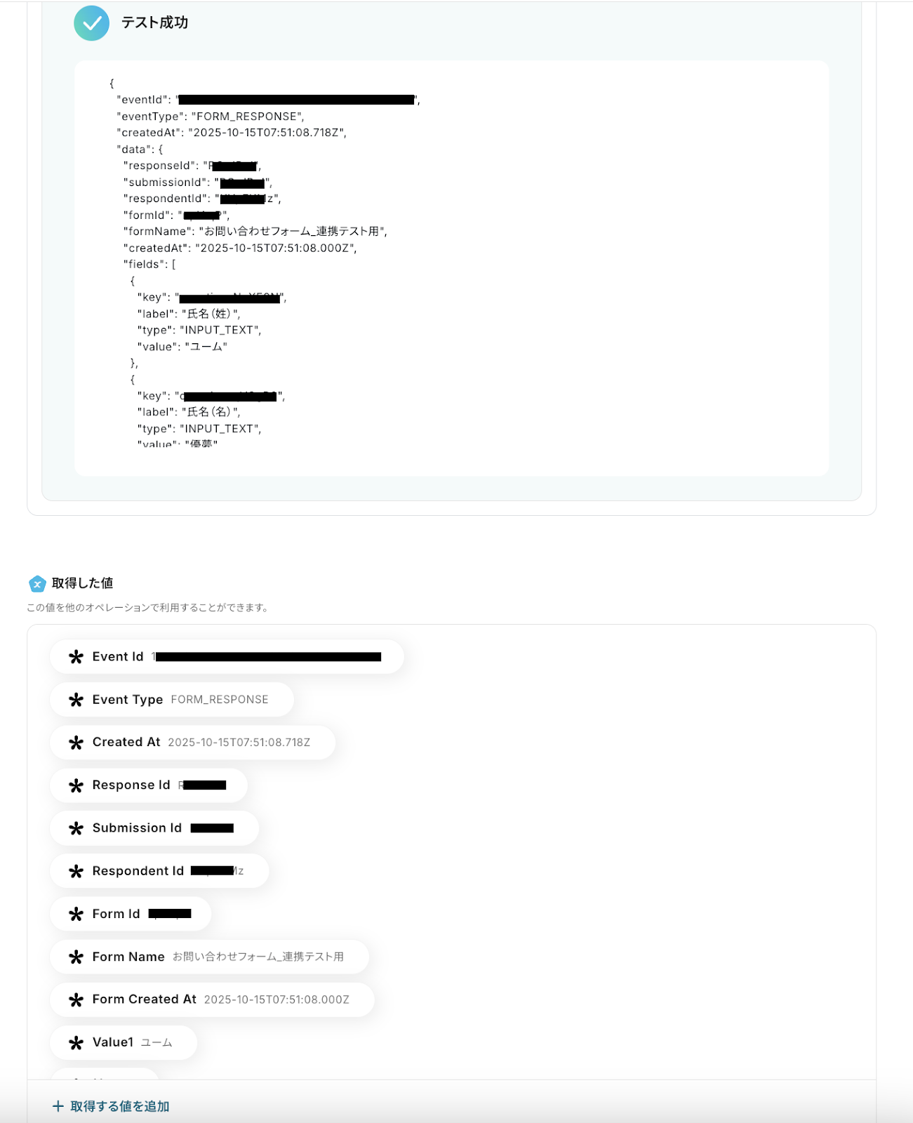 テストが成功すると、先ほど送信した回答情報が「取得した値」に抽出されるので、内容を確認してくださいね!
