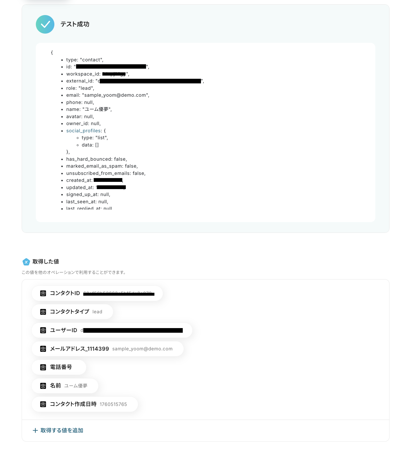 テストを成功させることで「取得した値」が取得でき、前述したように後続のオペレーション設定時に活用できます。
