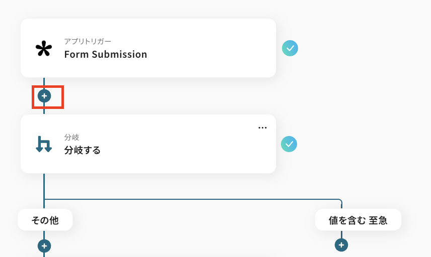 トリガー直下の「+」マークを押し、「分岐する」オペレーションを追加して設定することで、指定する条件に一致する回答に絞ってデータを連携できるようになりますよ!