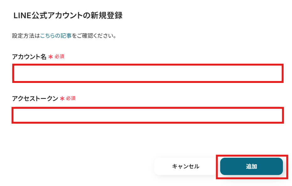 「アカウント名」と「アクセストークン」を入力して「追加」をクリックします。