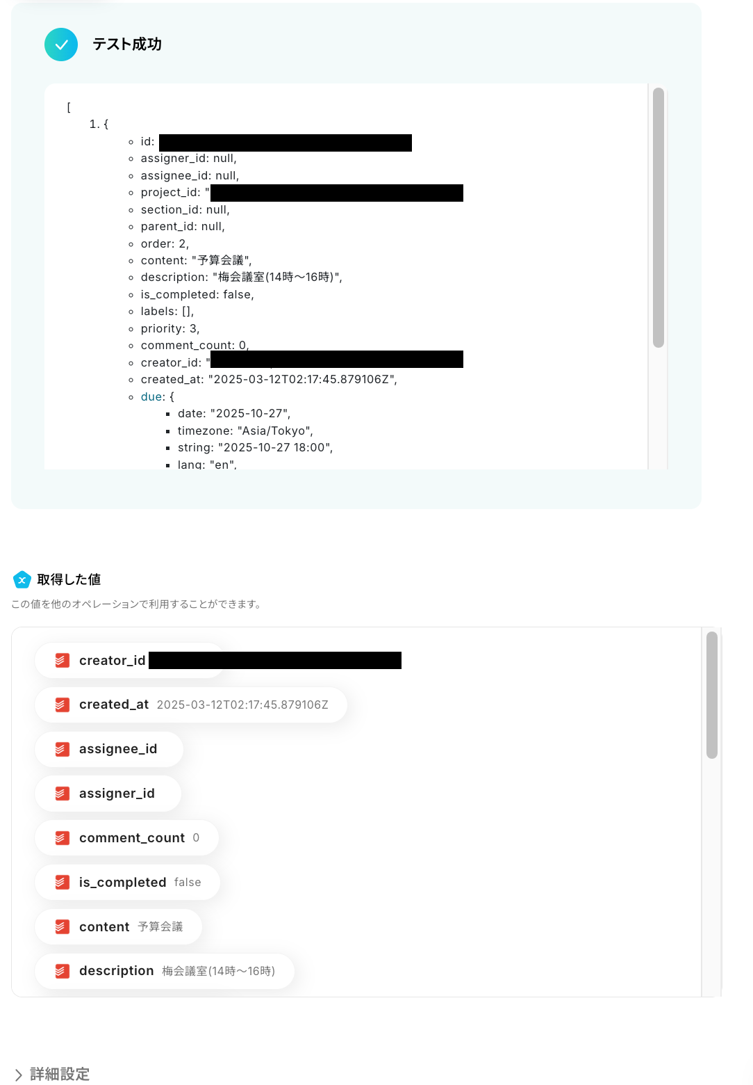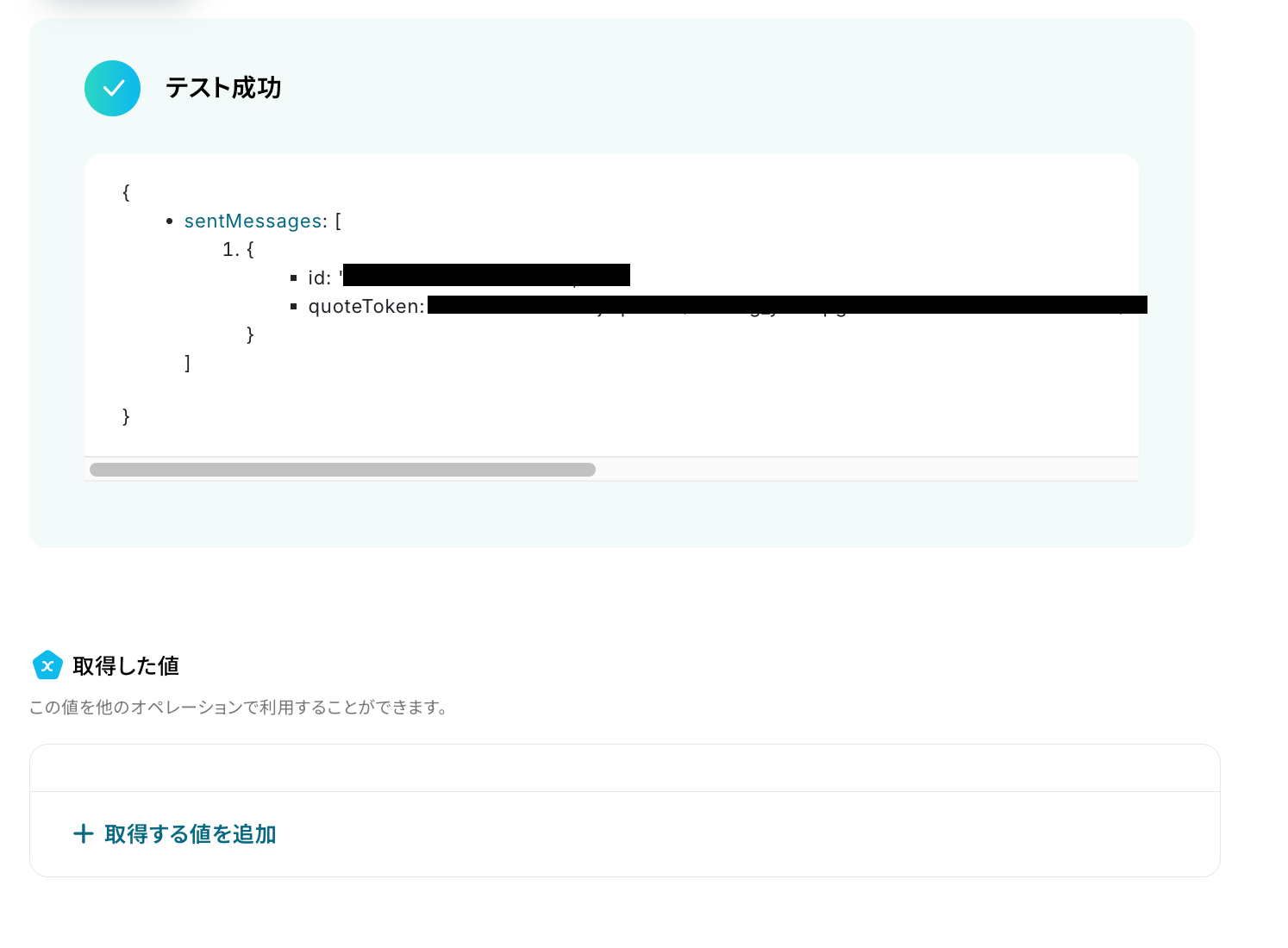 テストが成功すると、以下のように「取得した値」が表示されます。