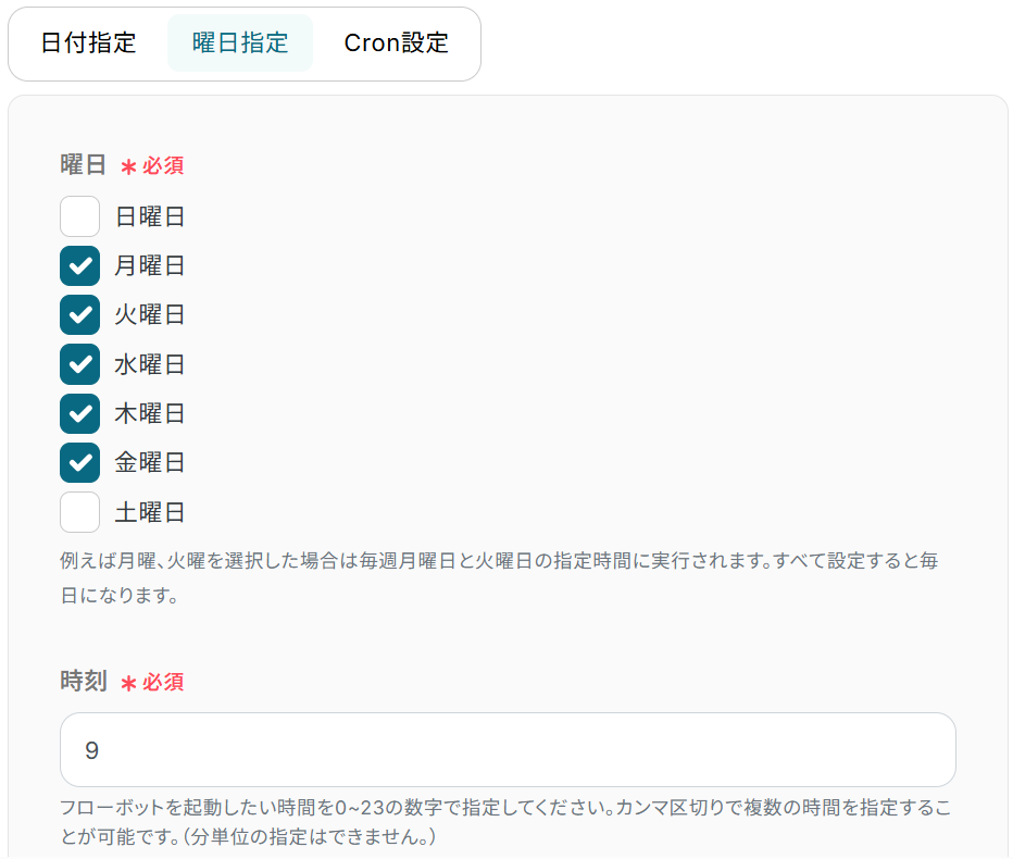 2) 曜日指定…フローボットを起動したい曜日にチェックを入れ、時刻を入力