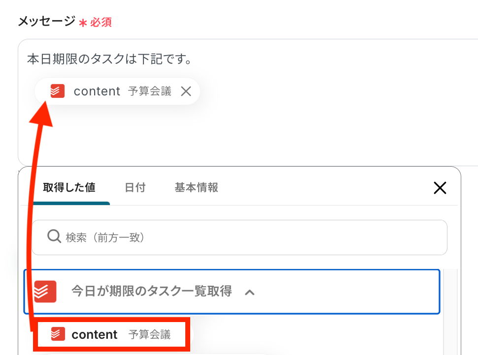 入力欄をクリックすると、前のステップで取得した値が表示されるので、選択して入力することができますよ。