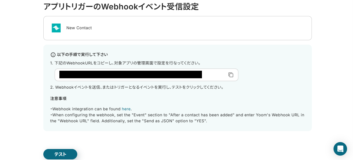 「イベント」セクションを「連絡先が追加された後」に設定し、「Webhook URL」欄にYoomのWebhook URLをペーストします。