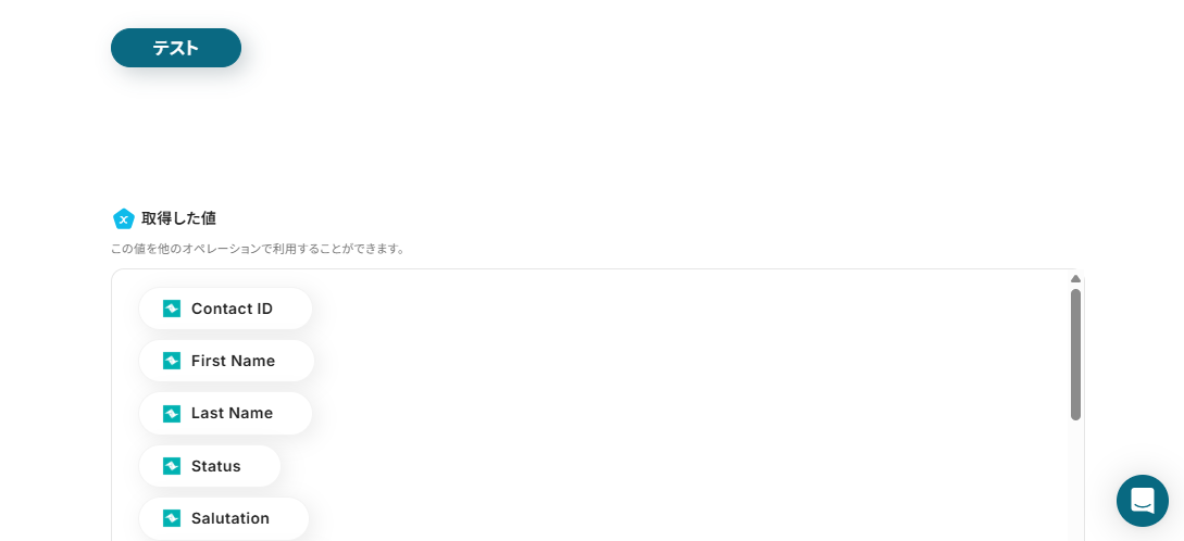 テストが成功すると、Teamleaderで先ほど作成したコンタクトの情報が取得した値(アウトプット)に表示されます。