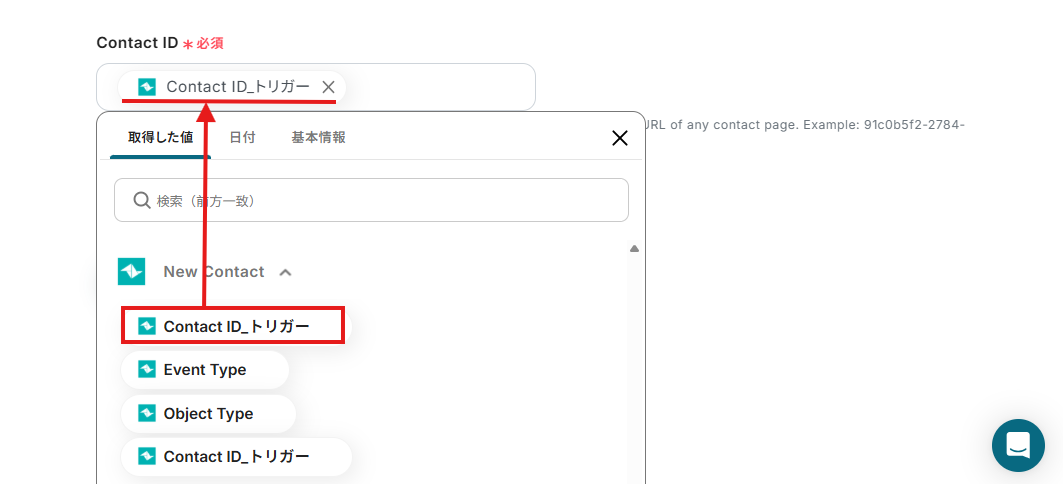 このように設定することで、Teamleaderに新しいコンタクトが作成されたら、そのIDを自動で引用し、コンタクトの詳細情報を自動で取得することができますよ!