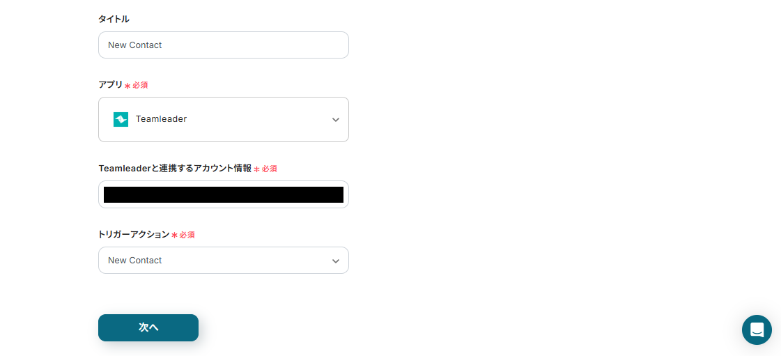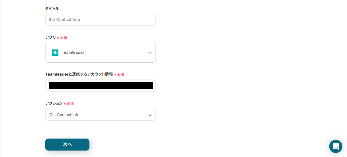 Teamleaderと連携するアカウント情報やトリガーアクションに誤りが無いことを確認できたら、「次へ」ボタンをクリックしましょう。