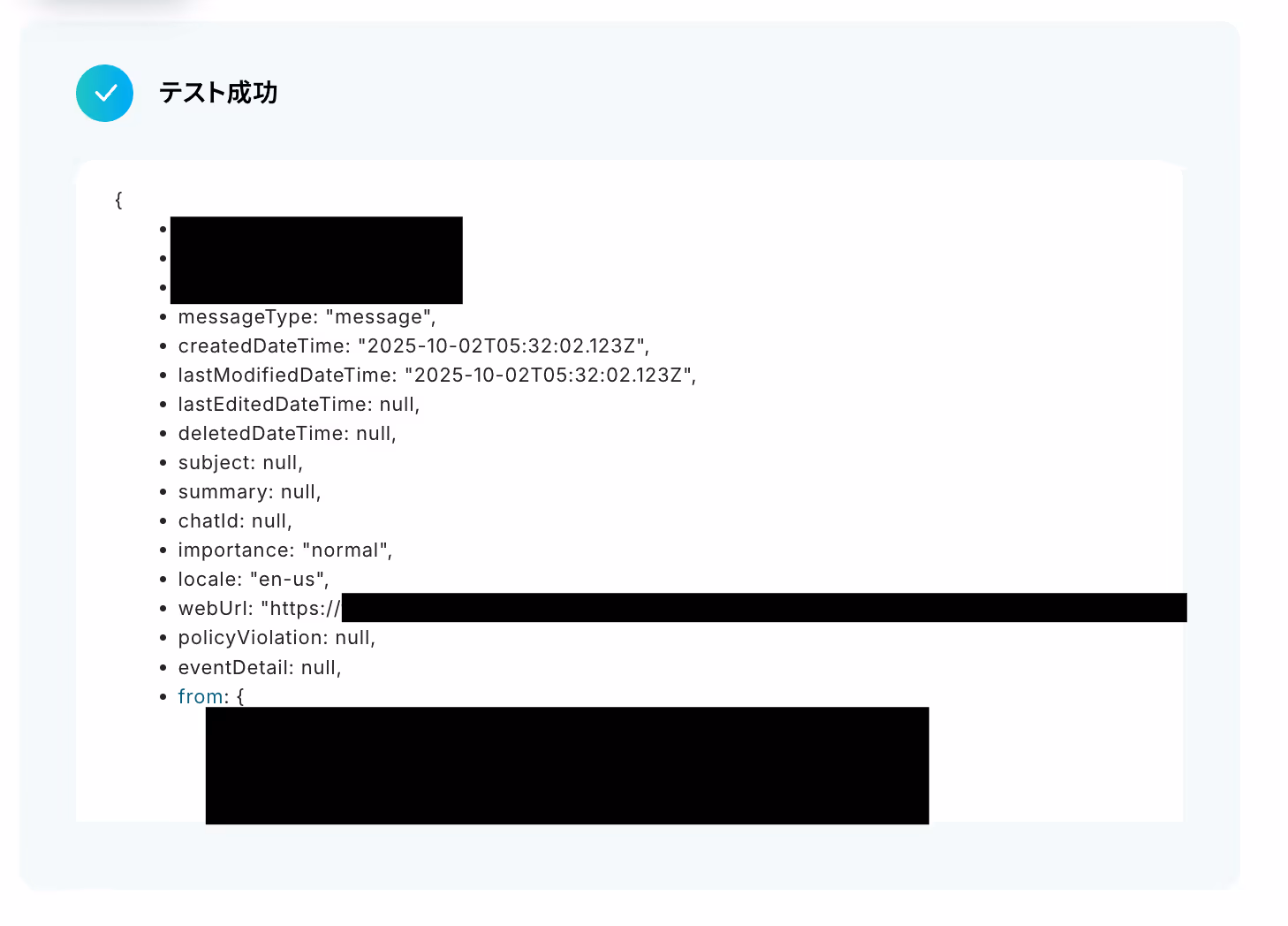 テストが成功するとMicrosoft Teamsから取得したメッセージ情報が表示されます。