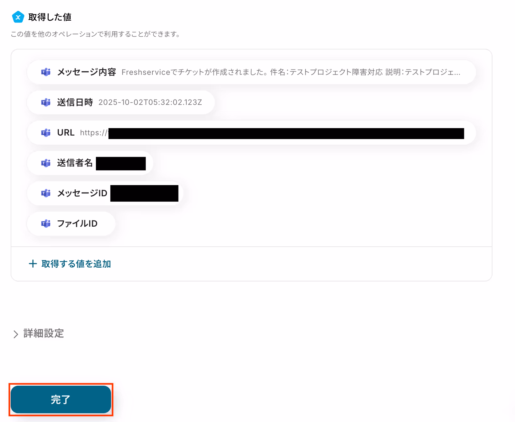 取得した値にMicrosoft Teamsの情報が反映していることを確認し「完了」をクリックします。