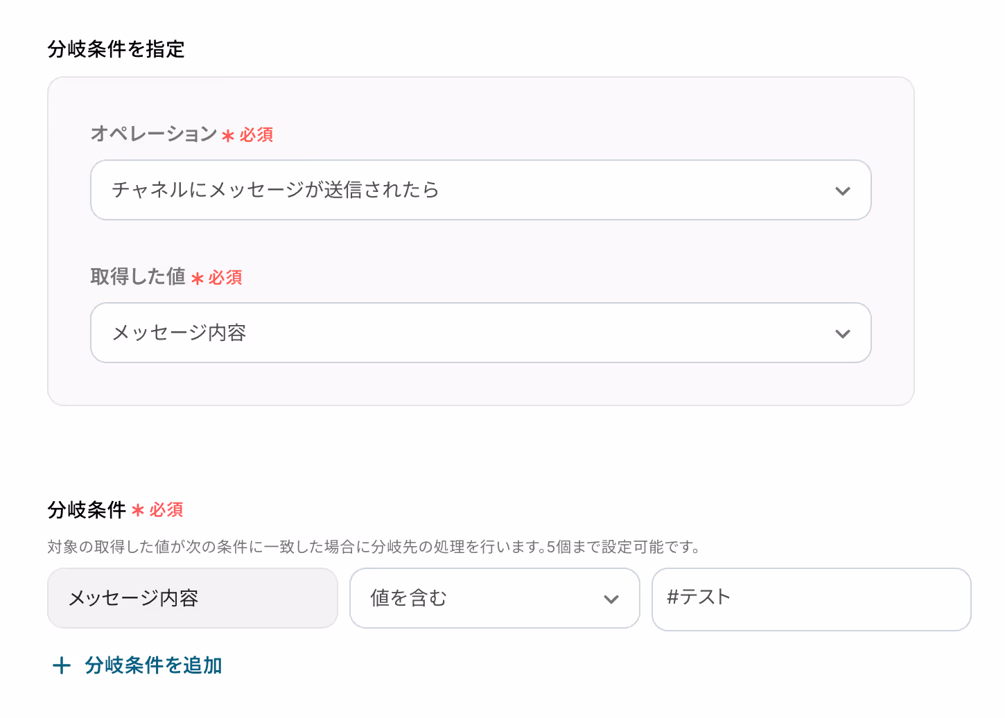 例えば、「#テスト」というメッセージを受け取った場合に分岐したいのであれば、分岐オペレーションを下記のように設定することで運用が可能となります。