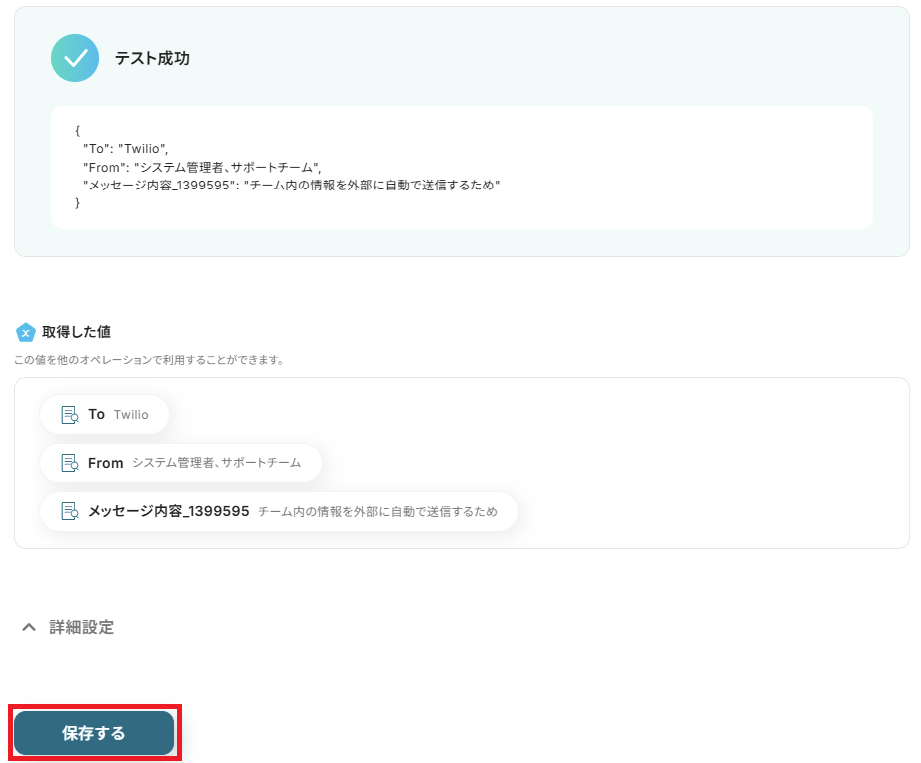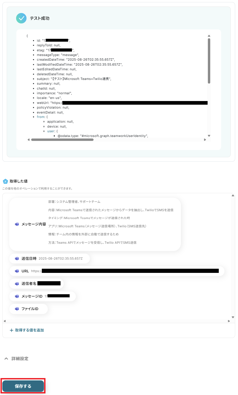 テストが成功すると、Microsoft Teamsで送信した情報が取得されるので、確認したら保存してください。