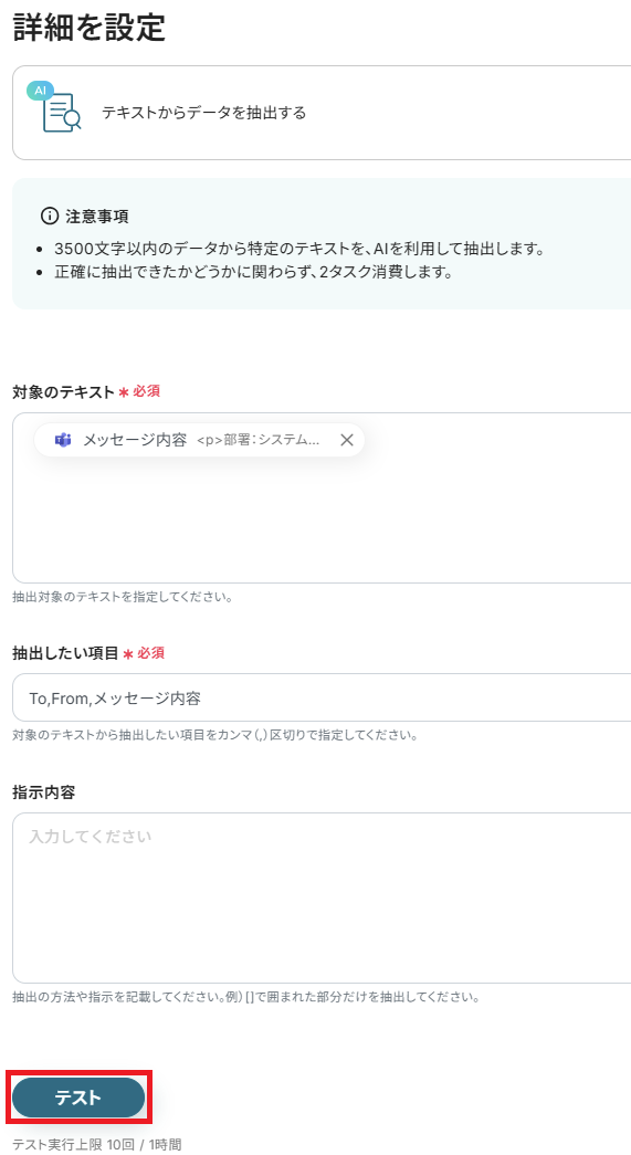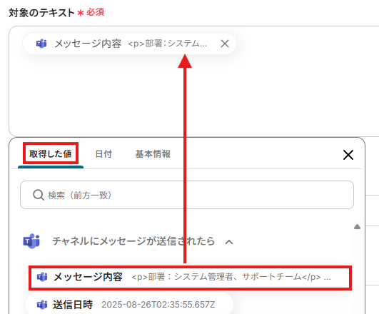 Microsoft Teamsで送信したデータから特定のテキストを抽出します。