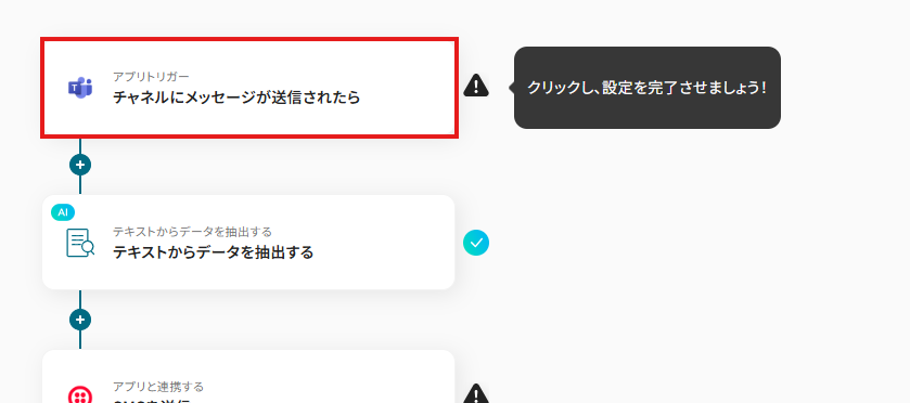 Microsoft Teamsのトリガー設定、テキストの抽出設定およびTwilioのアクション設定