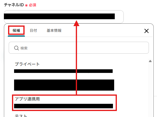 チャネルID:候補から先ほど送信したチャネルを選択します