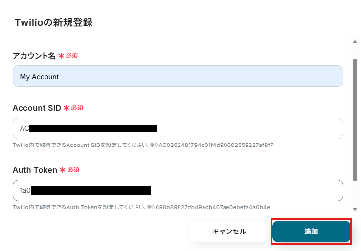 2.Twilioの新規登録 アカウント名を任意で決定し、Account SID・Auth TokenをTwilioの画面から確認して入力します。 入力が完了したら「追加」をクリックします。