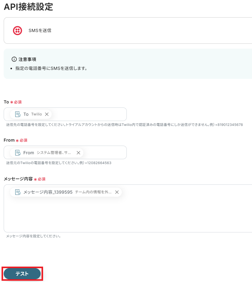 3.API接続設定 To、From、メッセージ内容:「テキストからデータを抽出する」で取得した値から、入力していきます 入力が完了したら「テスト」をクリックします。