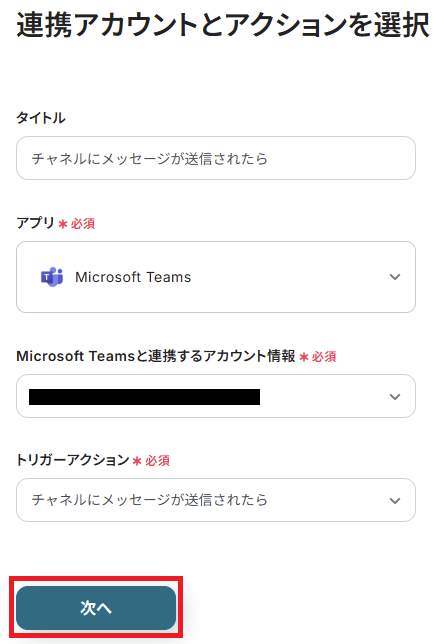 2.連携アカウントとアクションを選択 タイトルは、そのままで問題ありませんが、必要であれば変更してください。 アカウント情報を確認します。 トリガーアクションが「チャネルにメッセージが送信されたら」になっていることを確認して「次へ」をクリックします。
