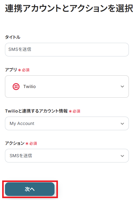 2.連携アカウントとアクションを選択 タイトルは、そのままで問題ありませんが、必要であれば変更してください。 アカウント情報を確認します。 アクションが「SMSを送信」になっていることを確認して「次へ」をクリックします。
