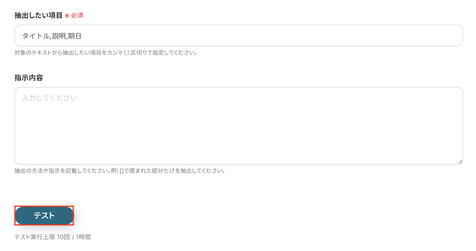 入力が完了したら、設定した項目が実際に正しく抽出されるかどうかを確認するため「テスト」をクリックします。