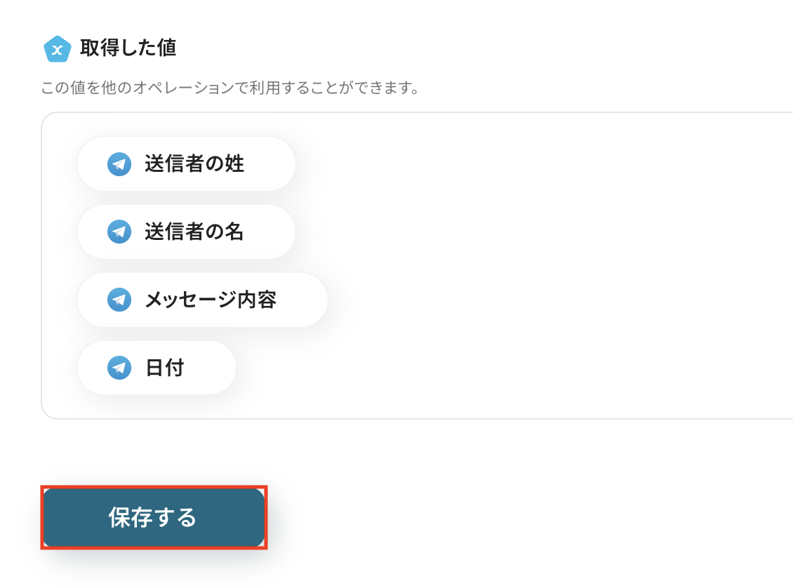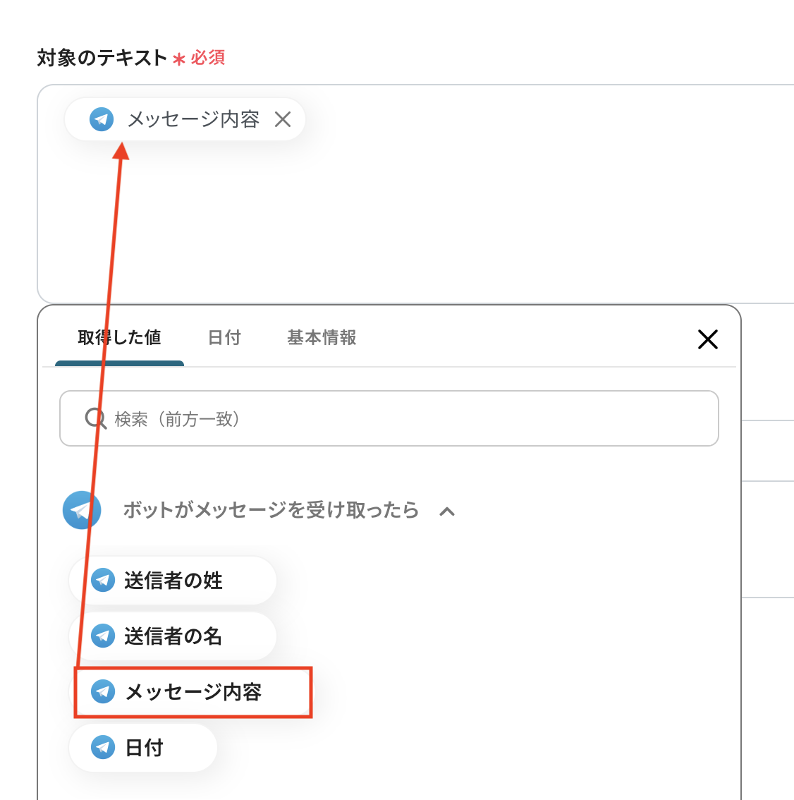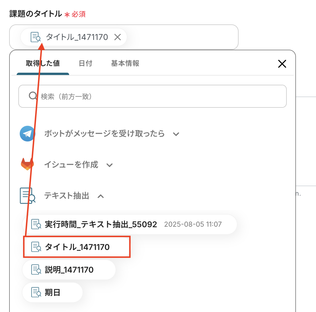 入力欄をクリックすると、前のステップでTelegramから取得済みのアウトプットが表示されるので、選択して入力しましょう。