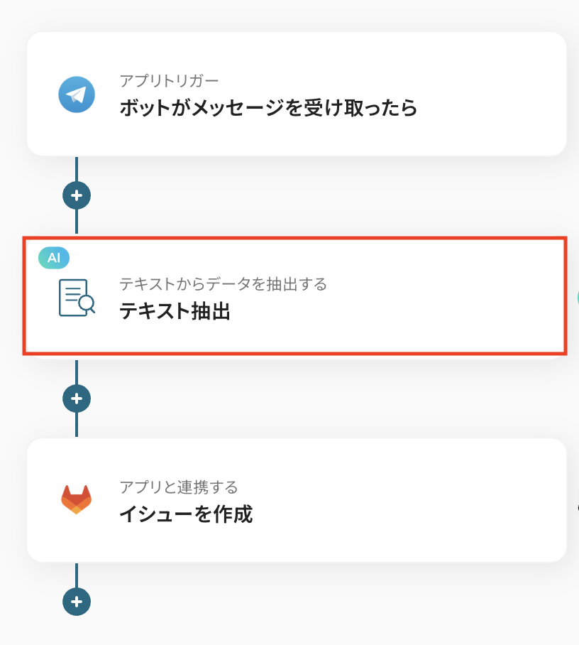 Telegramからトリガーイベントとして受信したメッセージ内容を対象に、AIで特定のテキストを抽出します。